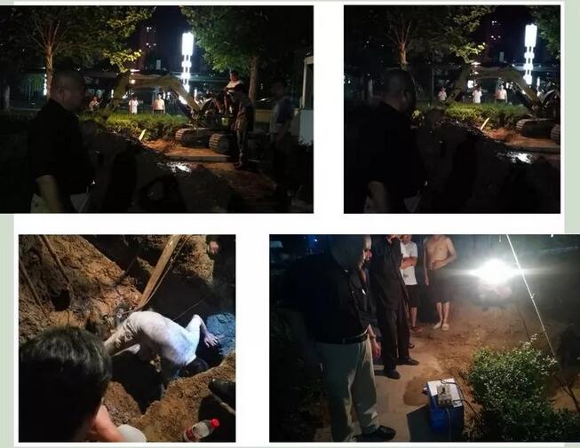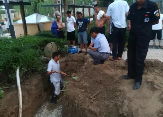 中午11点多,马望宽带领物业工作人员从4号楼北侧开始排查,先把地面上的绿化植物进行拔除清理,然后进行地面挖掘工作。不一会大家的衣服全部被汗水浸透,但员工们一想到业主们的用水问题,便一刻也不敢耽搁。大家忍受酷暑、汗流浃背,进行挖掘排查工作。工程、保洁、秩序维护员大家轮流上阵,尽量加快工作进度。终于在下午1点左右, 排查到是4号楼2单元地下管道接口处漏水。找到漏水原因后马经理立即联系自来水公司维修人员和挖掘机,对管道进行抢修。