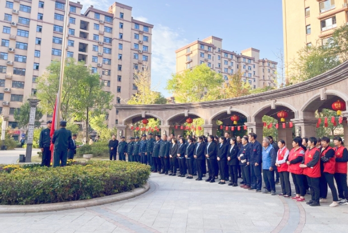 金秋硕果迎华诞、万里河山披锦绣。在国庆节来临之际,为弘扬爱国主义精神,营造喜迎国庆的浓厚氛围,10月1日,郓城区域全体物业项目部在中华家园物业服务中心举行升旗仪式,共同庆祝中华人民共和国成立75周年华诞。